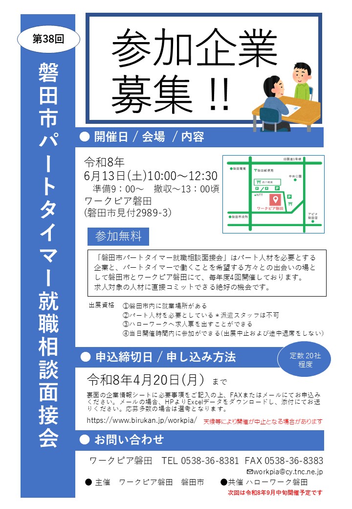参加資格 ・磐田市内に事業所がある企業 ・パートタイマーを必要とする企業(派遣企業は不可) ・ハローワークに求人を出すことができる企業