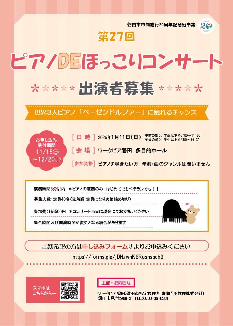 お待たせいたしました。第26回ピアノDEほっこりコンサートを開催します。