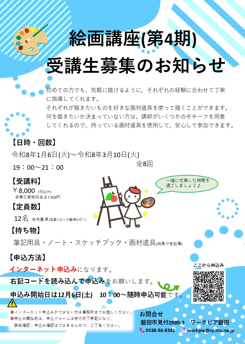 ・12月6日(土) 10:00以降で、インターネットで申し込みができなかった場合には、ワークピア磐田(0538-36-8381)までご連絡をお願いします。