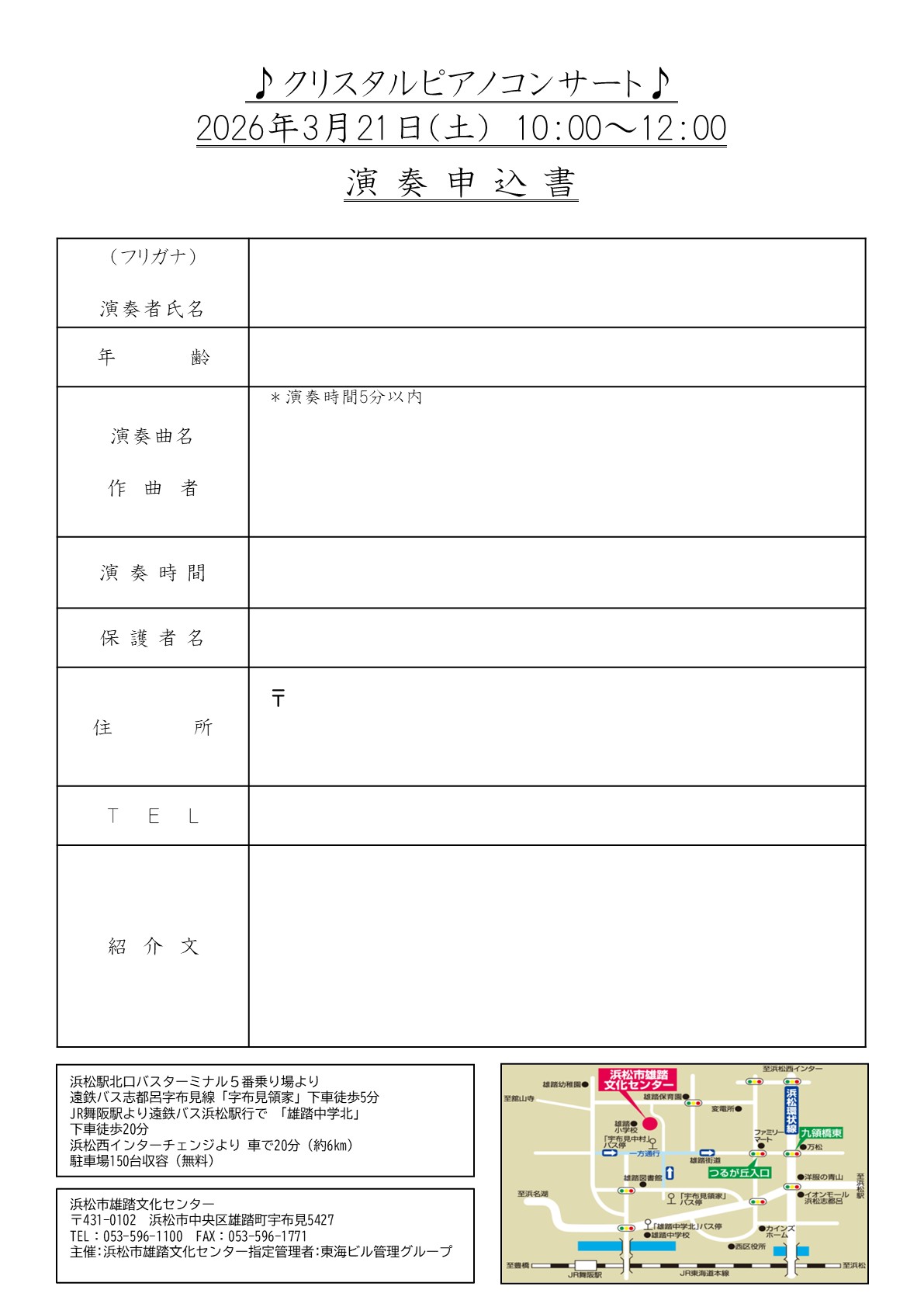 出演をご希望の方は2月15日(日) 9:00より、窓口・お電話(☎053-596-1100)・FAX(053-596-1771)にて受付いたします。